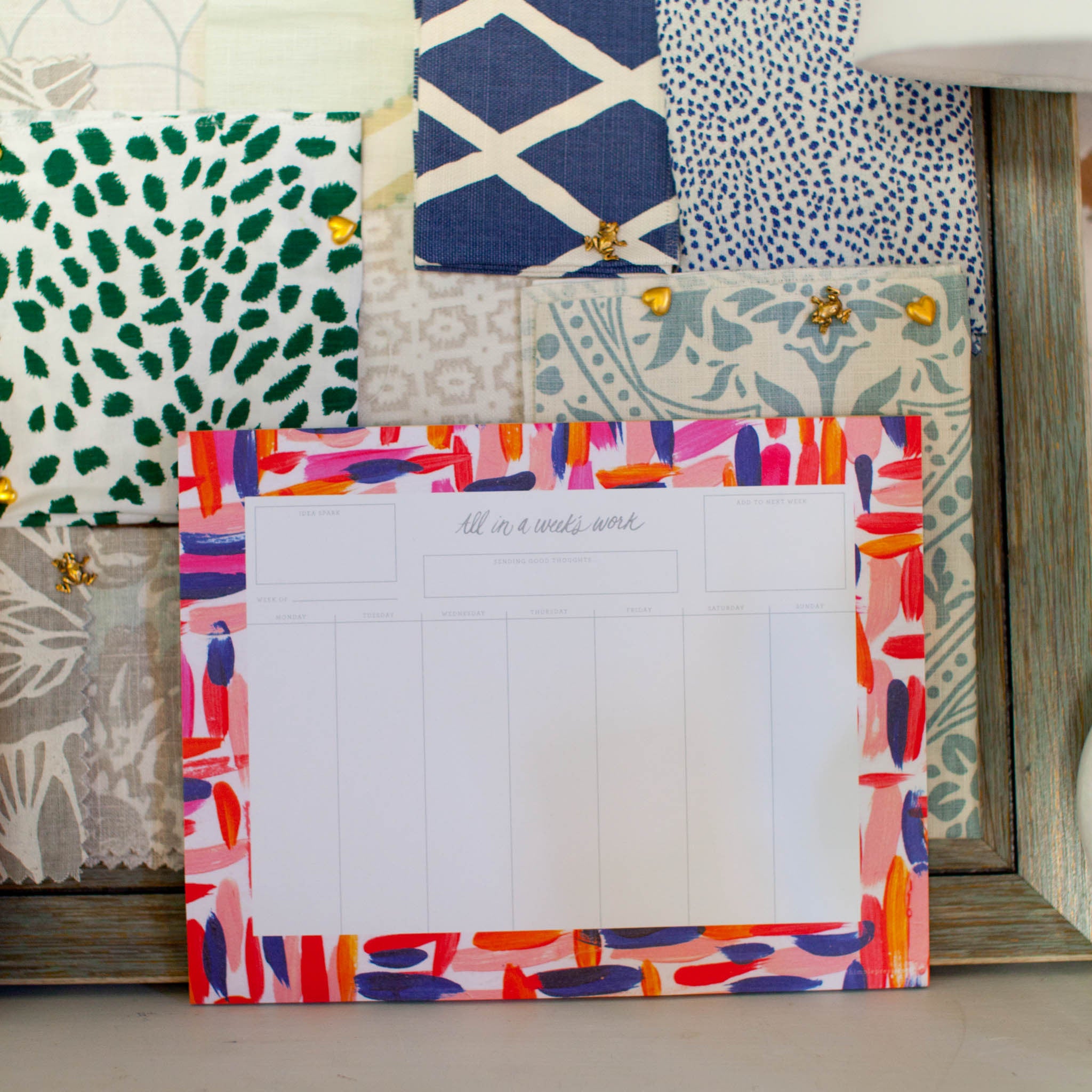 Stay organized in style with this calendar notepad that features an original watercolor illustration. The calendar week on this notepad runs Monday – Sunday with an “idea spark”, “add to next week”, and “sending good thoughts” writing areas. 50 sheets total.