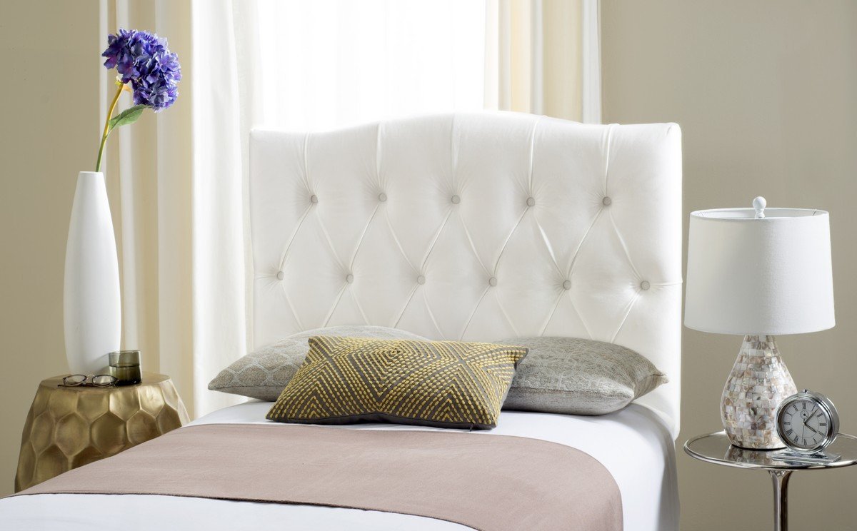 Dress up a guest room or master suite with the deeply tufted Axel headboard. With posh button-tufted upholstery in lush white velvet, this comfortably padded, gently curved headboard evokes images of 1930s Hollywood glam.