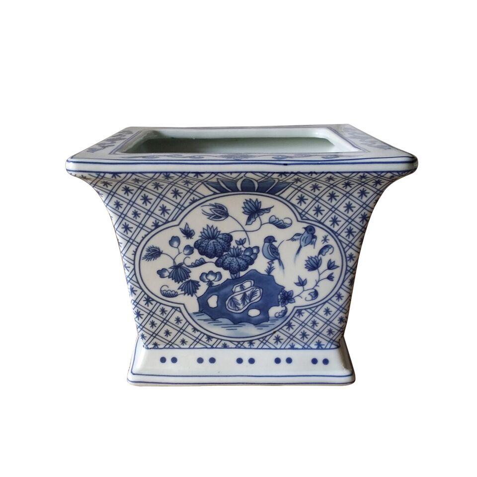 Porcelain blue and white square cachepot. A perfect addition to your living room décor on a shelf or mantel.