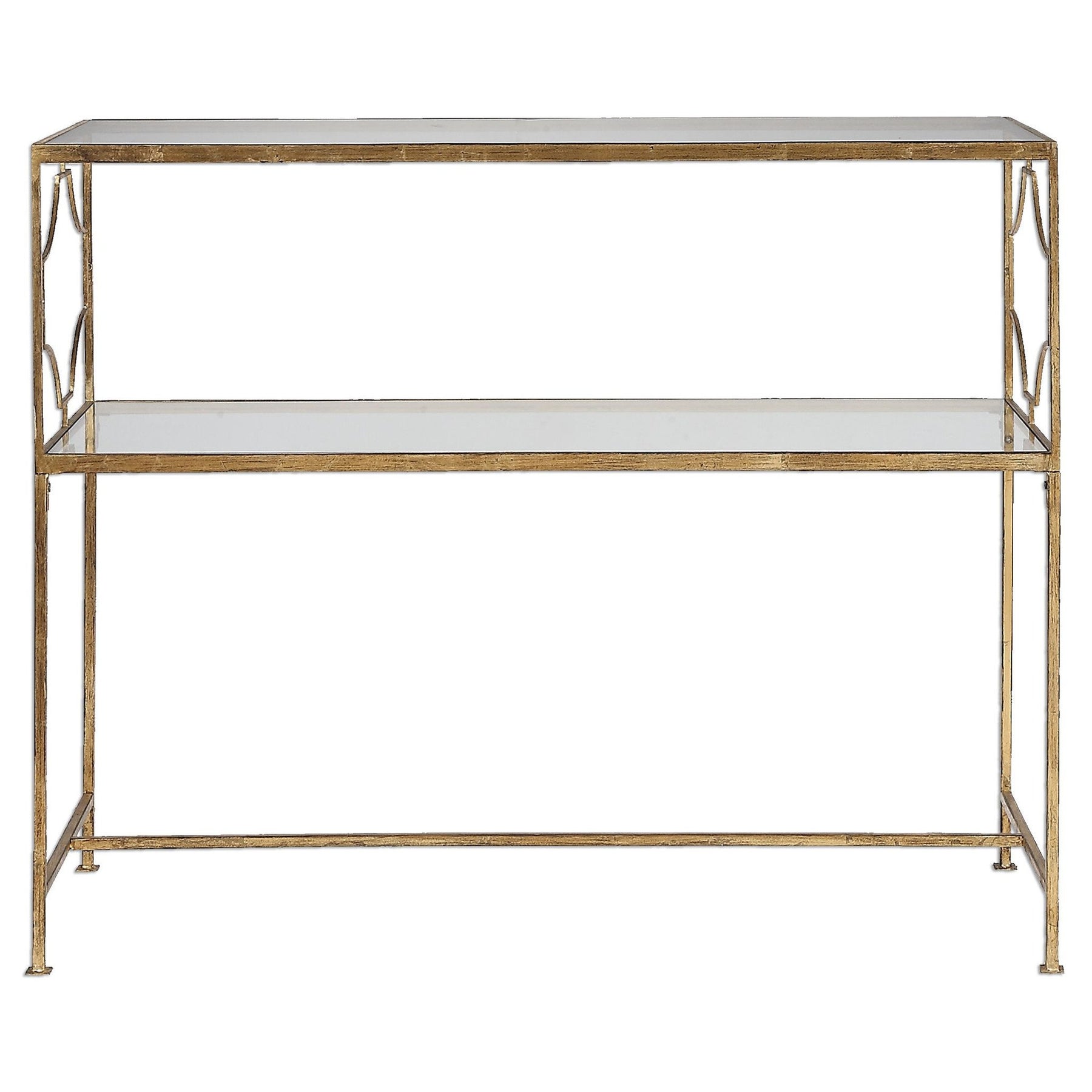 This console table by Uttermost is an upscale, traditional design in gold-leafed iron with moderate antiquing. The top and gallery shelf are made with clear, tempered glass.