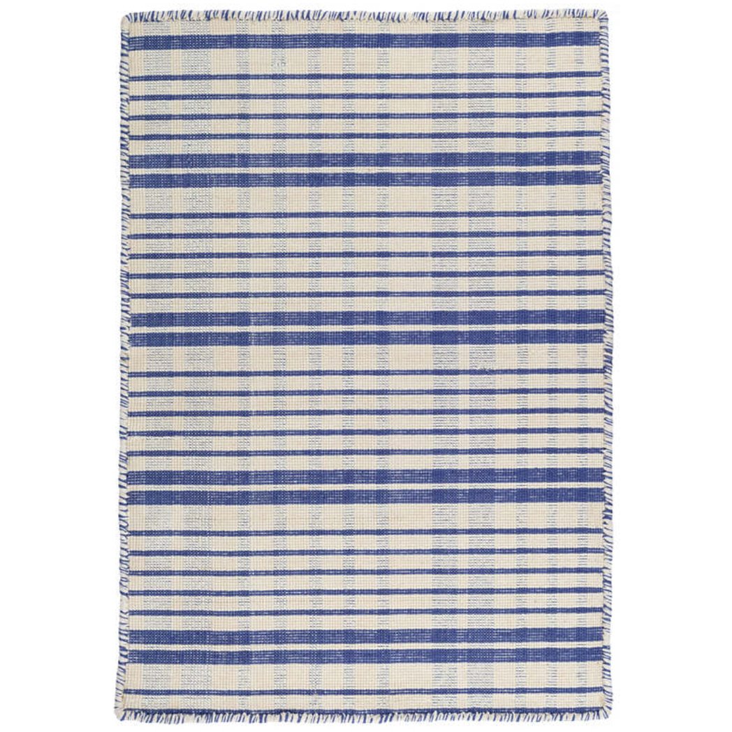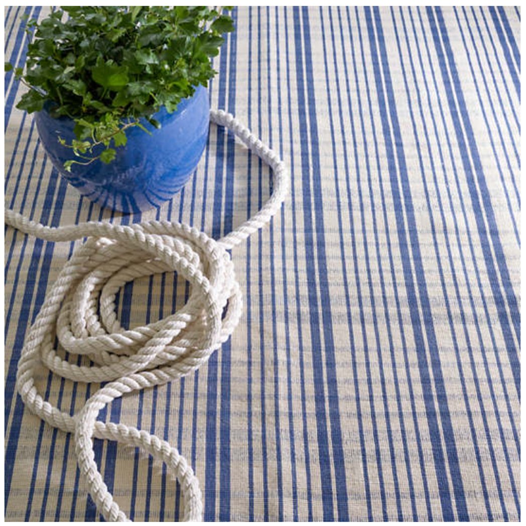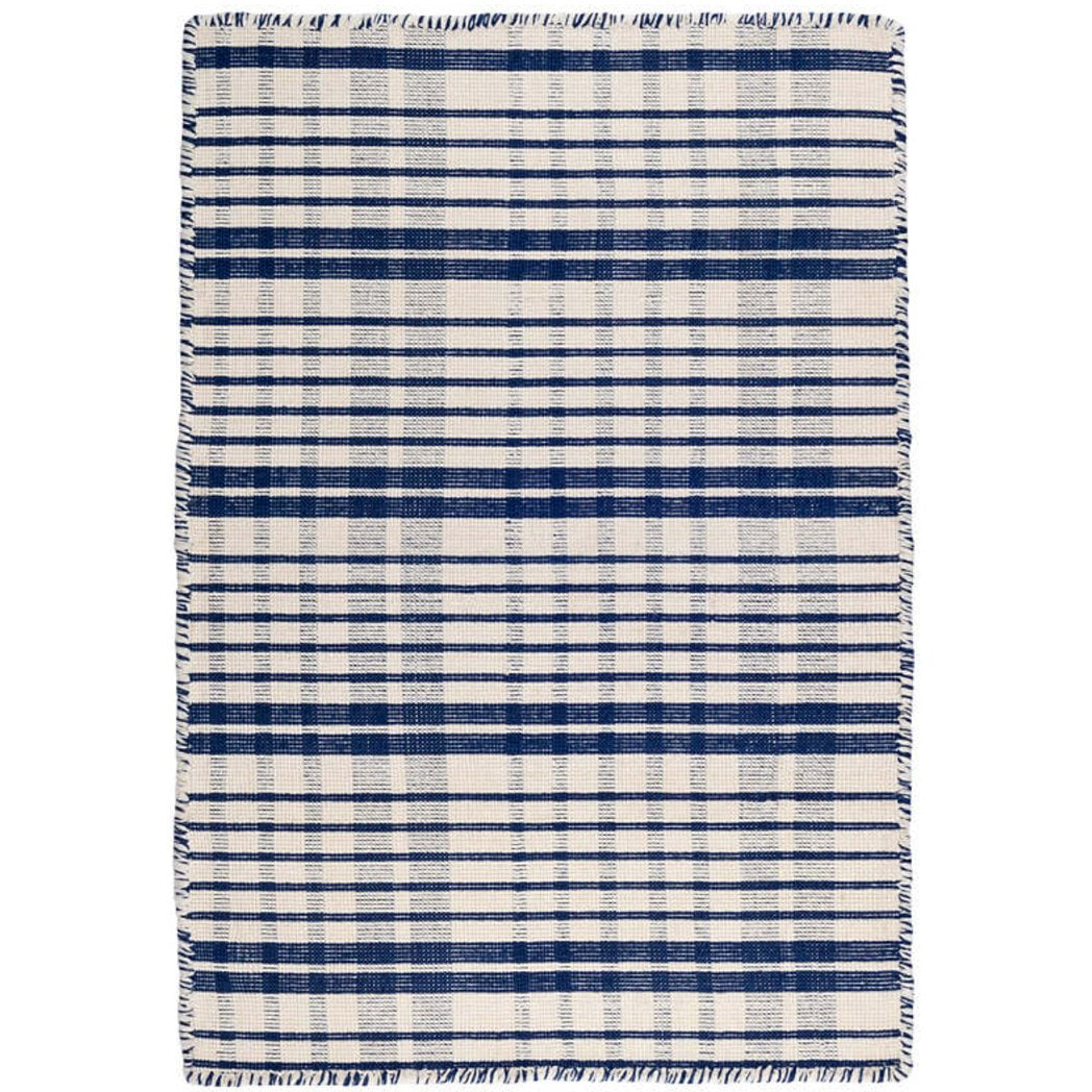 Wide bands of micro stripes, structured with crisp, banded edges on an ivory ground, bring modern balance and subtle texture to this woven cotton area rug. Constructed using a hand loomed flat weave in durable 100% cotton, and available in a choice of navy, Asiatic blue or wheat, it is perfectly designed to make a style statement in any space. This refined cotton rug is soft underfoot, versatile, affordable, and durable. One of the modern creations from the design collaboration between Annie and West Coast designer Mark D. Sikes, a traditional tailored look with a twist of east meets west. Made in India.