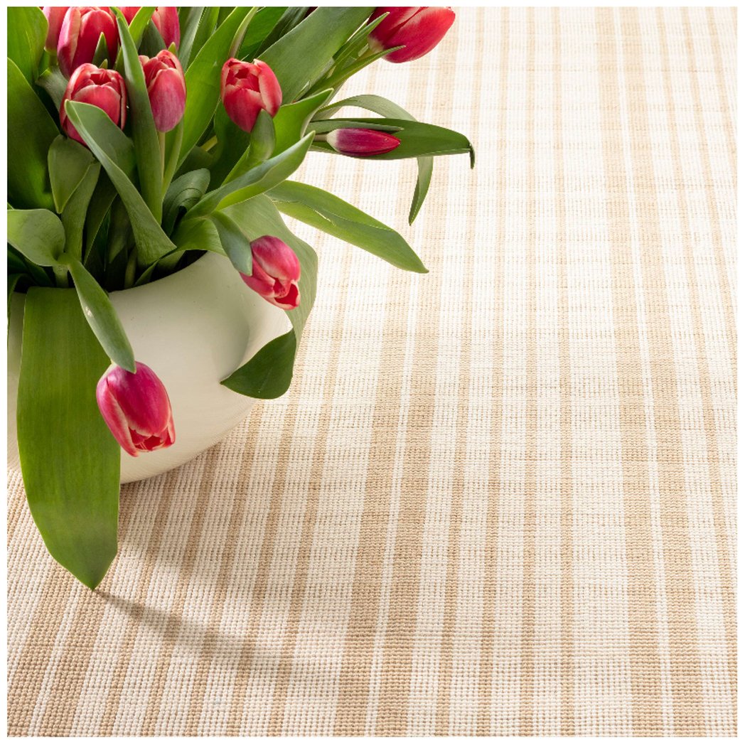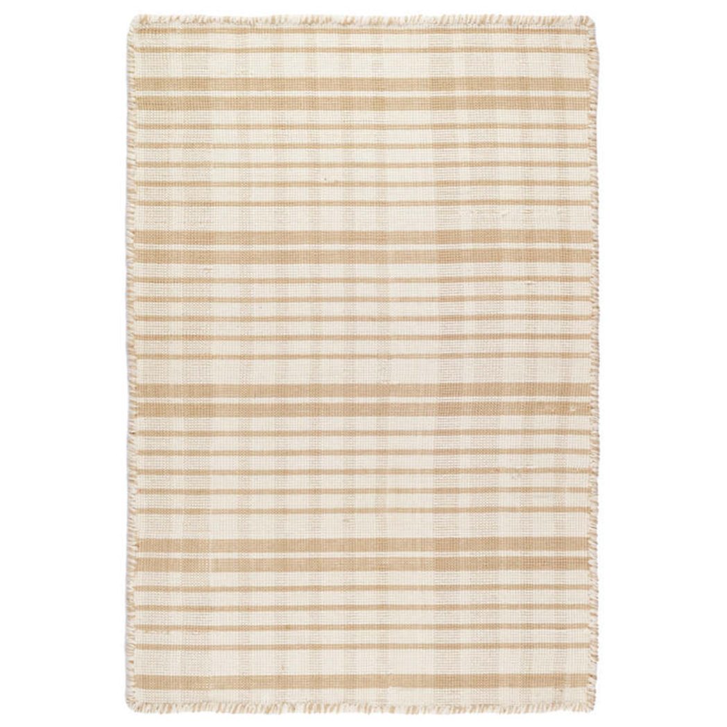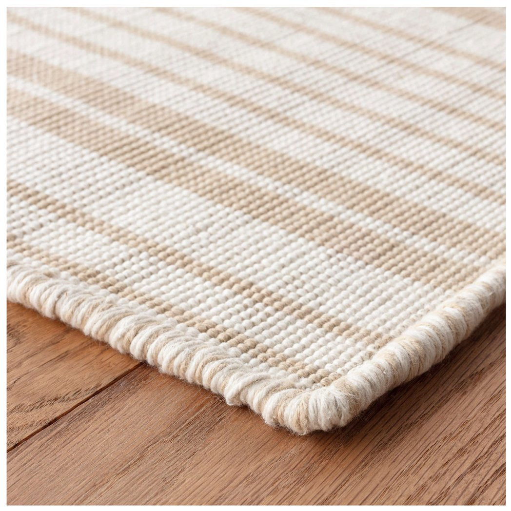 Wide bands of micro stripes, structured with crisp, banded edges on an ivory ground, bring modern balance and subtle texture to this woven cotton area rug. Constructed using a hand loomed flat weave in durable 100% cotton, and available in a choice of navy, Asiatic blue or wheat, it is perfectly designed to make a style statement in any space. This refined cotton rug is soft underfoot, versatile, affordable, and durable. One of the modern creations from the design collaboration between Annie and West Coast designer Mark D. Sikes, a traditional tailored look with a twist of east meets west. Made in India.