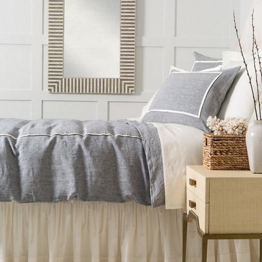 In a classic indigo and ivory combo, this linen chambray duvet cover, featuring a single pleat, is an easy, preppy piece with timeless appeal. Crafted to be an exact color match to our Hampton Ticking Linen Indigo duvet cover, shams, and decorative pillows. Made in India.
