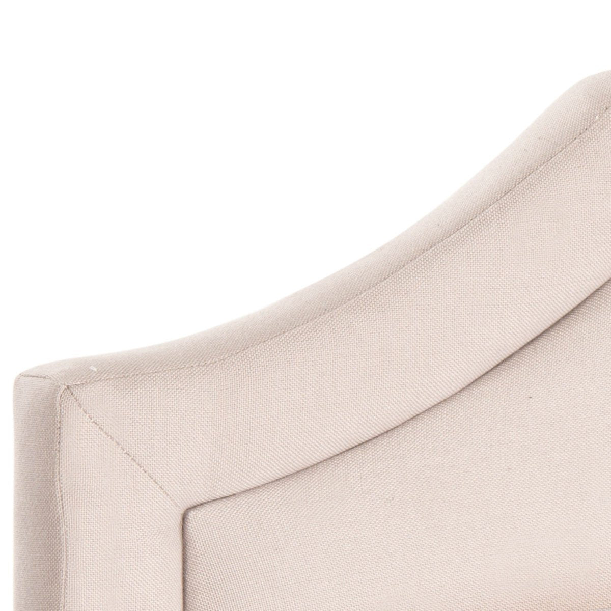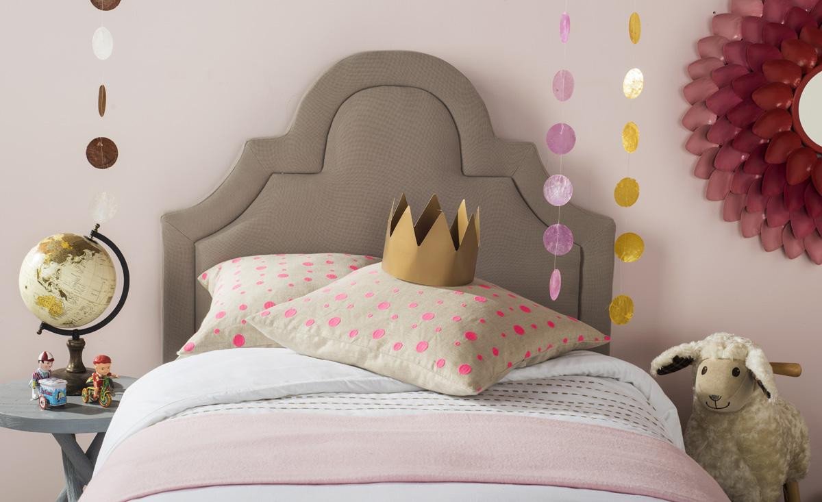 Romantic and refined, the beautifully arched Kerstin headboard adds architectural interest to any bedroom in need of a dramatic focal point. Luxuriously high for comfortable TV viewing and reading, this headboard is richly upholstered in deep taupe with extra padding emphasizing a lavish border. Attaches to any standard size metal frame bed. Color varies depending on dye-lot.