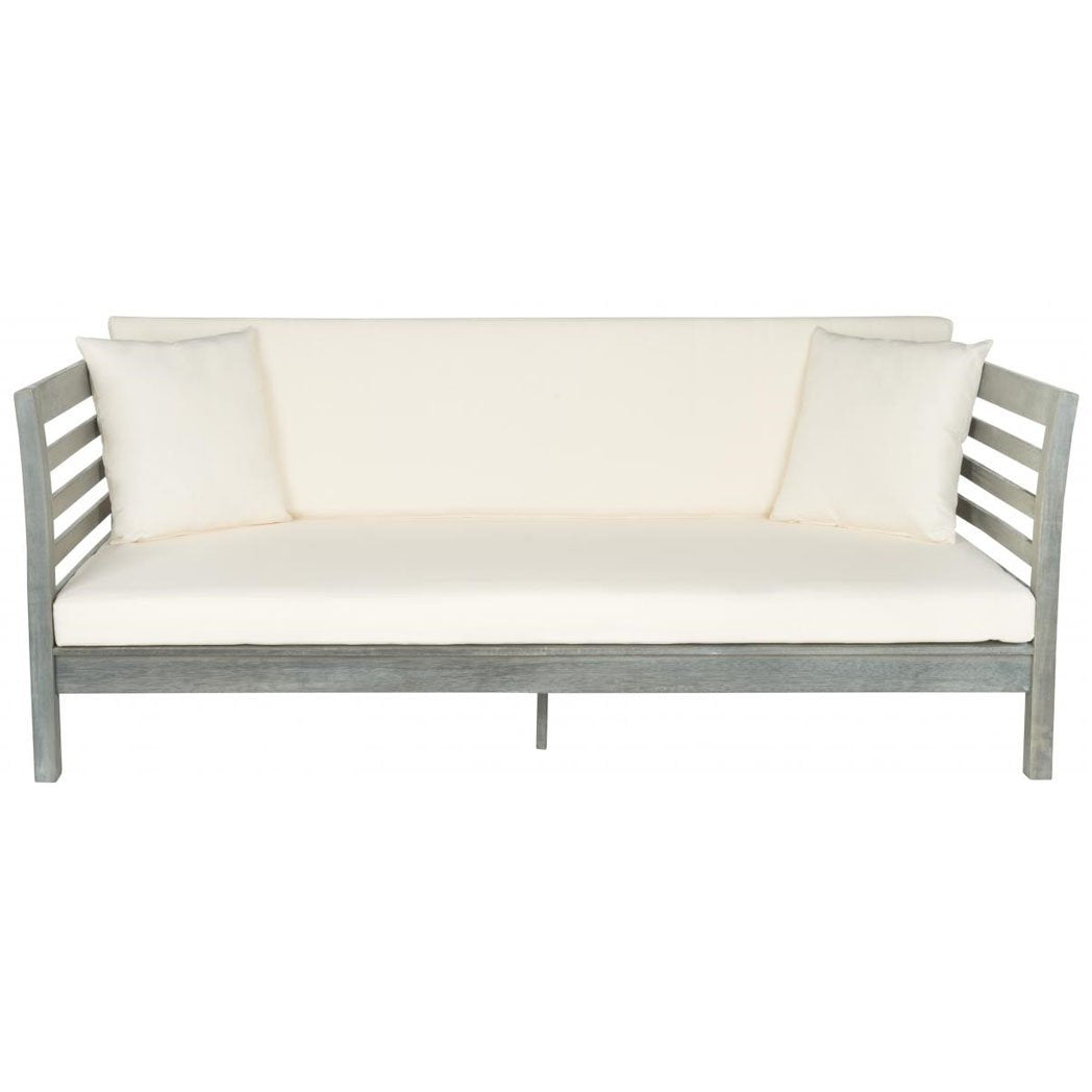 A contemporary twist on a resort classic, the Malibu daybed transforms any outdoor space into a relaxing Zen oasis. The sleek look of single seat and back cushions in beige all-weather fabric is contrasted with eco-friendly acacia wood in ash grey.