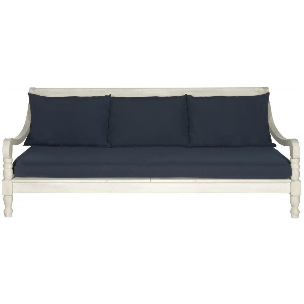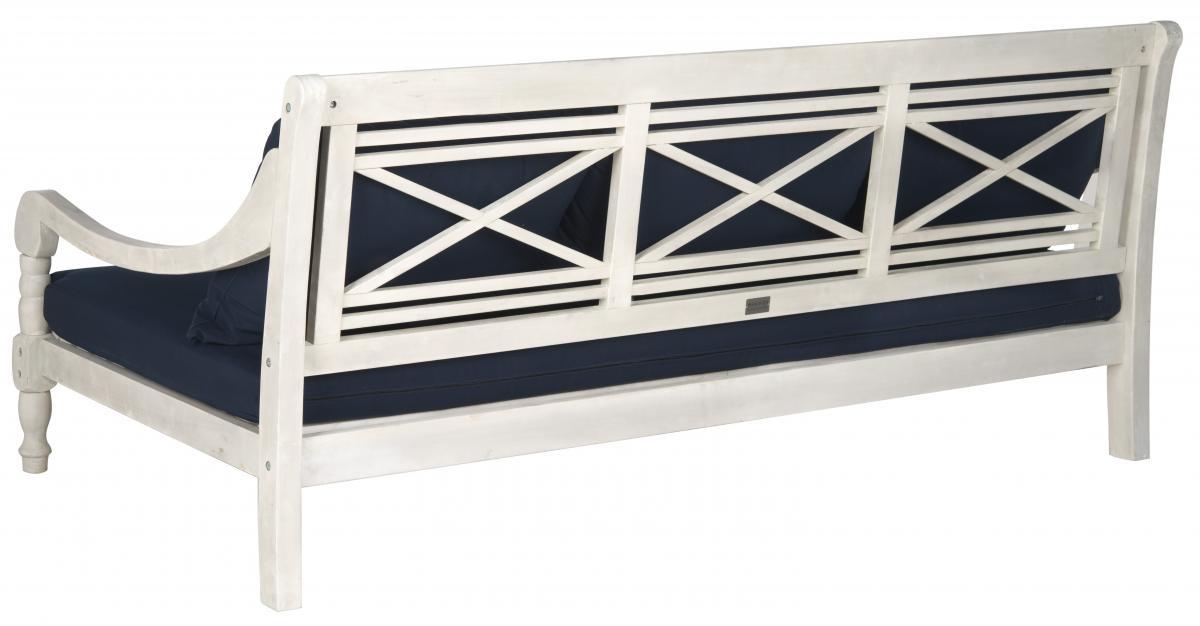 The ultimate indulgence, the Pasadena daybed recalls the casual elegance of a bygone era with generous proportions and classic British styling. Crafted of eco-friendly antique white acacia wood with navy all-weather cushions, it encourages luxe lounging.