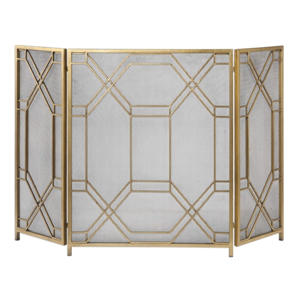 Forged iron finished in lightly antiqued gold leaf. Center panel is 26" wide and the side panels are each 13" wide.
