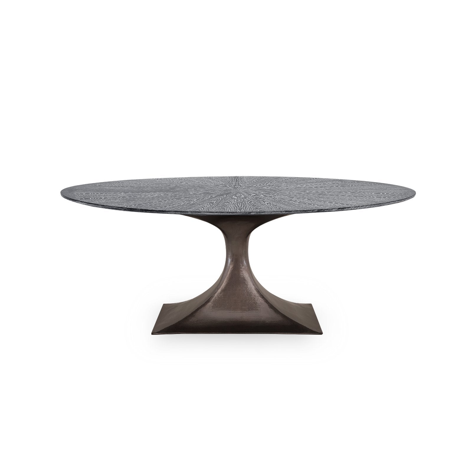 The glorious Stockholm dining table has an ancient-modern vibe that reads as Scandinavian in lighter finishes and South American in warmer, darker materials. Mix and match our wood and stone tops with a selection of specially hand hammered repoussé bases. The repoussé process forms metal by all-over hammering on the metal’s reverse to yield a crafted, shimmering surface that adds design interest from floor to table top. Available in bronze, nickel, and brass. Bases and tops sold separately.