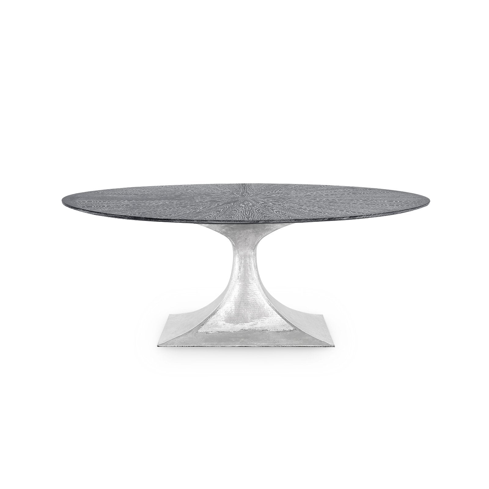 The glorious Stockholm dining table has an ancient-modern vibe that reads as Scandinavian in lighter finishes and South American in warmer, darker materials. Mix and match our wood and stone tops with a selection of specially hand hammered repoussé bases. The repoussé process forms metal by all-over hammering on the metal’s reverse to yield a crafted, shimmering surface that adds design interest from floor to table top. Available in bronze, nickel, and brass. Bases and tops sold separately.