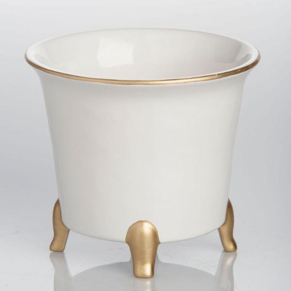 Large ceramic cachepot in lily white with gold touches on the tapered feet and top rim. Good value and great styling. Available in two sizes. Made in Portugal.