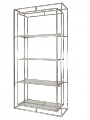 Double framed etagere in nickel or gold leaf with glass shelving. Dimensions between shelves is 17.5".